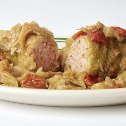Packo’s Stuffed Cabbage is a homemade blend of beef, pork, rice, and seasonings hand-rolled in steamed cabbage leaves and simmered in sour cream and tomatoes. It’s served as one large roll topped with tomato kraut and bread and butter for dipping.
