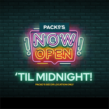 Game running late? Fridge getting empty? Packo’s has your back. Our Secor location is open until midnight for drive-thru and delivery, so you don’t have to miss a play (or brave the cold).